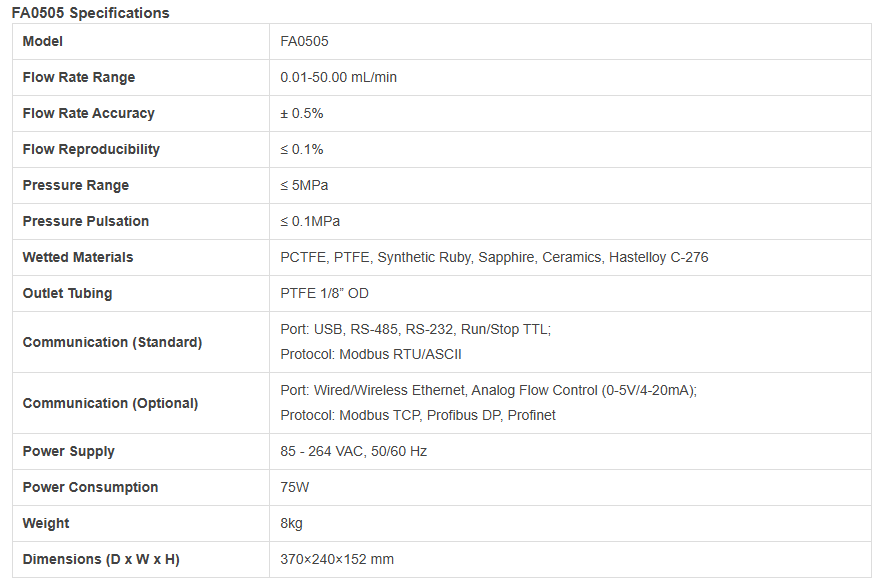 FA 시리즈 고압 PCTFE 펌프는 탁월한 정밀도, 고성능, 우수한 신뢰성, 높은 내화학성 및 낮은 맥동을 제공하는 고압, 정용량, 이중 피스톤 펌프입니다.