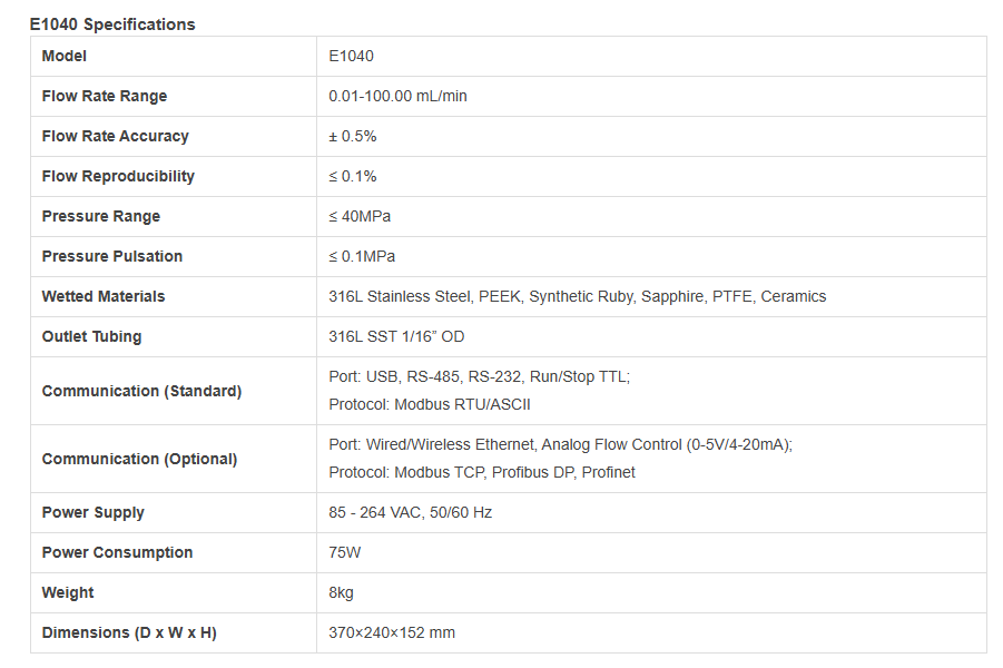 시리즈 E 스테인리스 스틸 펌프는 크로마토그래피뿐만 아니라 다양한 공정 및 산업 분야에 적합하도록 설계되었습니다. 탱크 반응기, 마이크로채널 반응기, 공정 스키드 제조업체에 공급되며, 석유화학, 화학, 폴리머 생산, 환경 과학, 제약, 신에너지, 전자, 식품 산업 등 다양한 분야에서 널리 사용되고 있습니다.